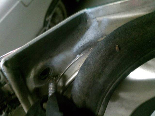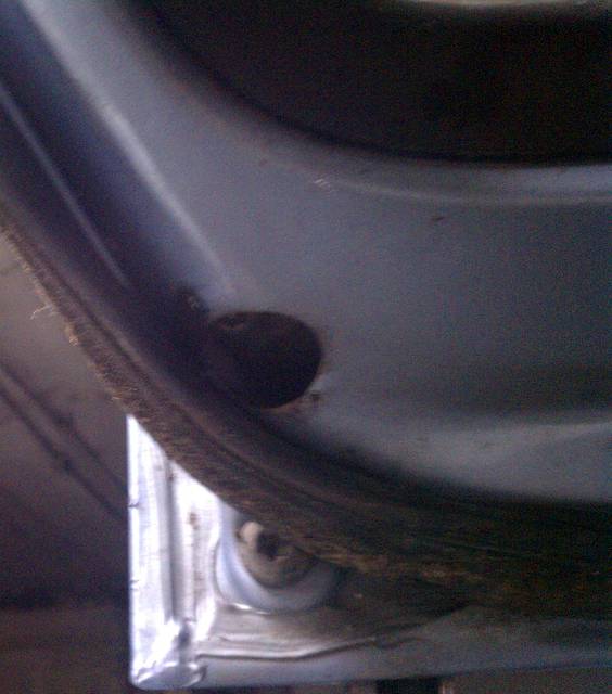The bolt inboard of the rubber seal is shorter and has an integral washer, and its protected space (away from the elements) means it’s relatively shiny and new. A hole in the tailgate sheet metal provides access to this bolt …
