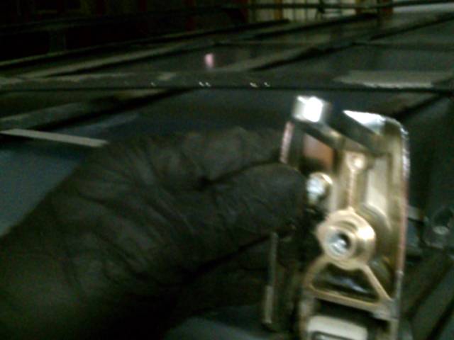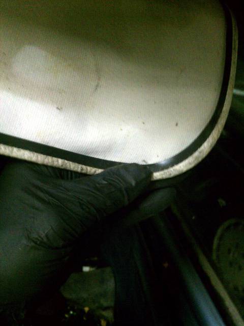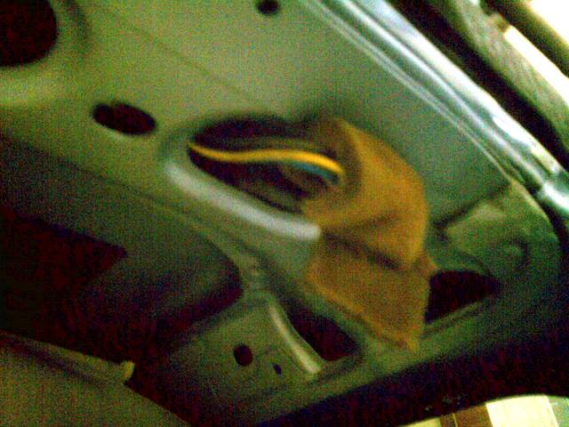 … but I first needed to stick a flat screwdriver into that hole, to pry the wiring out of the way. It was a lot easier when I pushed the wiring towards the glass, i.e., towards the inside of the tailgate, as opposed to towards the edge, i.e., away from the center.