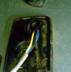 … the hinge is no longer attached to the car, and it can be pivoted up. This is a good time to feed the wiring on each side up and out of the sheet-metal hole, made specifically for this purpose. On each side, between the hinge and the car, is a rubber gasket.